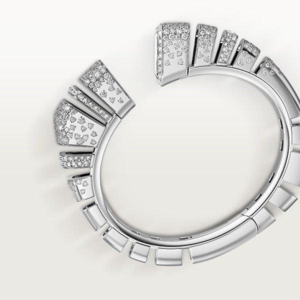 Reflection de Cartier watch, quartz movement. Rhodium-finish white gold 750/1000 case set with 109 brilliant-cut diamonds totalling 1.54 carats. Rhodium-finish white gold 750/1000 bracelet set with 433 brilliant-cut diamonds totalling 5 carats. Sandblasted silvered dial, rhodium-finish steel sword-shaped hands, sapphire crystal. Case dimensions: 18.4 x 17.5 mm, thickness 8.9 mm. Water-resistant up to 3 bar (approx. 30 metres).