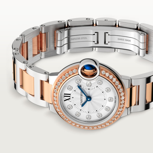Ballon Bleu de Cartier watch, 28 mm. Quartz movement. Steel case, fluted rose gold 750/1000 crown set with a synthetic cabochon-shaped spinel. Bezel and 12-zone flinqué dial set with 53 brilliant-cut diamonds totalling 0.53 carat. Blued-steel sword-shaped hands. Sapphire crystal. Interchangeable two-tone bracelet.9.35 mm thick. Water-resistant to 3 bar (approx. 30 metres).